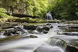 The waterfall is located on the Walden Beck, a tributary of the River Ure, in West Burton, which traverses a fault in the bed of the shelving rock.[2][3][4] The initial step of the waterfall is a steep cascade which flows east, then immediately south into a plunge pool, the section under the packhorse bridge then cascades into another pool.[5] The first drop falls 20 feet (6 m), and is sometimes referred to as Upper Cauldron Falls.[6][7] The upper falls section is surround by a north-facing "limestone amphitheatre", over which the water falls.[8] The lower section of the falls travel under a stone bridge known locally as Blue Bridge.[9]