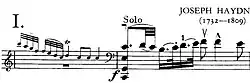 Although the full work was discovered in 1961, Haydn had written the beginning of the principal theme of the first movement in his draft catalogue of 1765.[2][3] This early work, nearly contemporaneous with symphonies 6, 7 and 8 and predating his D major cello concerto by around twenty years, already shows Haydn as a master of instrumental writing. The solo cello part is thoroughly idiomatic. The concerto reflects the ritornello form of the baroque concerto as well as the emerging structure of the sonata-allegro form. As in the baroque concerto grosso, the accompanying ensemble is small: strings, two oboes, and two horns.[1] It is possible that Weigl was the only cellist in the Esterházy Orchestra when Haydn composed the concerto, since there is only one cello line in the score, marked alternately “solo” and “tutti.” There is also, however, a basso continuo line, that might have been played by another cellist, or by Haydn himself on the harpsichord, or by a string bass player.
