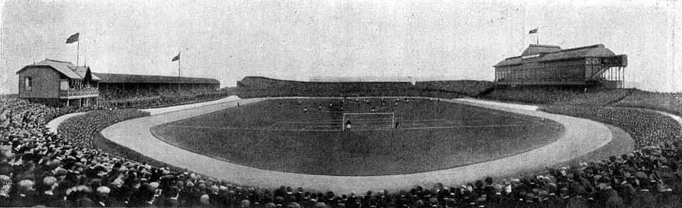 Before the First World War, Celtic Park was a multi-event venue.[1] It hosted the first ever composite rules shinty-hurling match in Scotland, in 1897.[77] Track and field meetings were held every summer, while the only World Cycling Championship to be staged in Scotland was held at Celtic Park in 1897.[1][78] An experimental floodlit football game was played on Christmas Day 1893.[1] This was unsuccessful due to the ball repeatedly striking the lamps, which were hung over the pitch by wiring.[1] Rugby league football was first played in Scotland at Celtic Park, when it hosted a game between a Northern Rugby Football Union representative side and the touring Australian team in 1909.[79] Open-air Masses and a parade for the Coronation of King George V were staged.[1] Celtic Park, along with many other football stadiums, hosted recruitment drives during the First World War.[80] During one such event at Celtic Park, a demonstration of trench warfare was carried out.[1][80] The quarter-final of the All-Ireland Hurling Championship between Kilkenny and Glasgow was held at the stadium on 21 June 1913.[81] The first pukka speedway race meeting in Scotland was held at Celtic Park on 28 April 1928. It staged 12 meetings in all before closing in July 1928[1] (although some of the events may have been staged at the neighbouring Nelson Recreation Ground).[82]