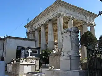 Located on a terrace of the cerro Panteón, the cemetery features a portico entrance, which is located directly across the street from the entrance to the Cementerio de Disidentes. This Greek temple-like gate was built in the Neo-classical style with fluted Doric columns. The portico contains a replica of the Pietà by Michelangelo.[1]