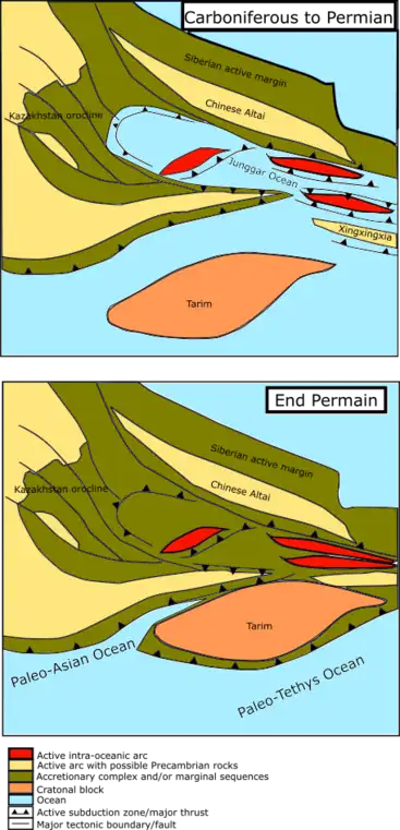 27. ^ a b Xiao, Wenjiao; Han, Chunming; Yuan, Chao; Sun, Min; Lin, Shoufa; Chen, Hanlin; Li, Zilong; Li, Jiliang; Sun, Shu (August 2008). "Middle Cambrian to Permian subduction-related accretionary orogenesis of Northern Xinjiang, NW China: Implications for the tectonic evolution of central Asia". Journal of Asian Earth Sciences. 32 (2–4): 102–117. Bibcode:2008JAESc..32..102X. doi:10.1016/j.jseaes.2007.10.008. ISSN 1367-9120.