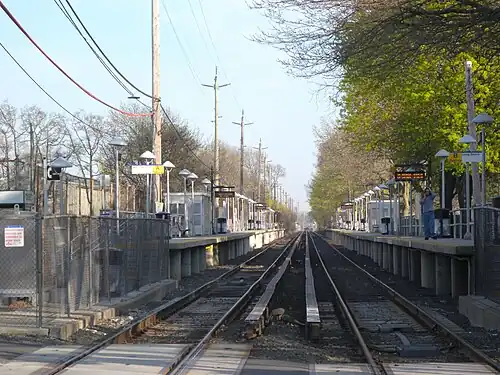 Centre Avenue station was originally located a block to the west and had a station house, but was moved east when high-level platforms were installed in the late 1960s in order to facilitate the new M1 railcars. Parts of the original platform are still visible along the trackside towards Lynbrook.[5]