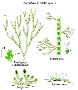 Chaetophorales is an order of green algae in the class Chlorophyceae.[1] Algae in the order Chaetophorales consist of filamentous, branched algae. The thalli have two parts, a prostrate and upright section and the filaments are variously branched. The algae are found in freshwater habitats or terrestrial habitats.[2]