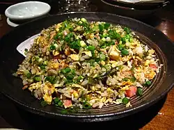 Chahan is a Japanese fried rice dish typically cooked in a wok.[3][1] Rice is used as a primary ingredient, and a wide range of additional ingredients can be used including scrambled egg, vegetables, onion, garlic, edible mushrooms such as shiitake, tofu, pork, as well as seafoods such as crab meat, roe, and shrimp.[1][4][5][6][7] Oils such as canola oil, sesame oil and sunflower oil are used to fry the dish.[1][6] The dish can be seasoned with soy sauce, oyster sauce, sesame oil, salt, pepper and katsuobushi, a dried and flaked tuna product.[6][7] Shiso, an Asian culinary herb, may also be used to flavor chahan.[8] Nori, a dried edible seaweed product, can be used as a garnish.[8]