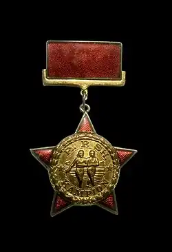 The medal was given to adult athletes who performed in first level competitions. It had the shape of a five-pointed star in red, with sheaves of wheat forming a gold circle and inside the image two athletes (boy, girl), above which were written the initials R.P.SH. (Republika Popullore e Shqipërisë), with two small stars in each side.[3][4]