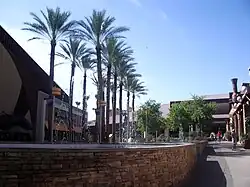 Adjacent to the food court entrance of the mall is an outdoor entertainment and dining plaza called The Village. The entertainment and dining options at The Village include the Harkins Theatres, Escape the Room, and Buffalo Wild Wings. A popular attraction of the outdoor plaza used to be the Dancing Waters fountain featuring a display of water, lights and music. The fountains were later demolished in the Summer of 2014 and renovated into a picnic area that featured patio seating, lawn areas, and a children's splash pad. Over the years, restaurants in The Village started to close such as Kona Grill, California Pizza Kitchen, Starbucks, Sir Vesa's, BJ's Restaurant & Brewhouse, and most recently The Old Spaghetti Factory. These closures left The Village at a 33% occupancy. Surrounding the mall there are many large retail centers including Chandler Festival, Chandler Gateway, Chandler Village Center and the Boulevard Shops at Chandler Fashion Center, all of which Westcor used to own.