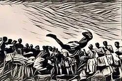 Ngolo mimics the animal behavior, and the base techniques of engolo seems to be derived from the specific way of zebra fighting.[6] A defining feature of engolo is the "zebra kick", back kick executed with the palms touching the ground.[6]