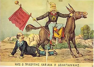 Trikoupis tried to make terms with the creditors of his nation, but he failed in that too. The taxation measures he proposed to combat the country's bankruptcy aroused great hostility, and in January, 1895 he resigned.[3] At the general election, four months later, he and his Modernist Party were astoundingly defeated by his main political rival, Theodoros Deligiannis, and Trikoupis did not even manage to win a seat in the parliament. This led to him resigning from politics and moving to Cannes.