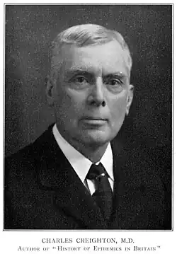 Charles Creighton (22 November 1847 – 18 July 1927) was a British physician and medical author. He was highly regarded for his scholarly writings on medical history but was widely denounced for disputing the germ theory of infectious diseases.
