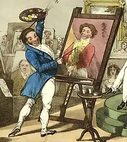 D'Oyly sketched incessantly and took an active interest in the arts generally, finding these leisure pursuits to be an agreeable way to relieve the boredom associated with colonial life. He produced landscapes, scenes of Indian life, portraits, and caricatures, primarily in watercolour, and also wrote satirical verse.[14] His work was influenced by his friend, the painter, George Chinnery, who stayed with D’Oyly and his wife in Dacca in 1802–03.[15] A unique feature of his illustrations is the representation of relations between colonials and Indians.[16] Unlike other artists of the period, D’Oyly was not afraid to depict drunkenness and debauchery in his illustrations.[17] His published work, which was invariably heavily illustrated, encompassed a variety of subject matter, from natural history to social satire, and was occasionally written in verse.[18]