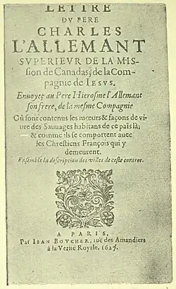 Charles Lallemant, SJ (French pronunciation: [ʃaʁl lalmɑ̃]; or Lalemant; November 17, 1587 – November 18, 1674) was a French Jesuit missionary. He was born in Paris in 1587 and later became the first superior of the Jesuit Missions amongst the Huron in Canada. His letter to his brother, dated August 1, 1626, inaugurated the series Relations des Jésuites de la Nouvelle-France about the missionary work in the North American colonies of New France.