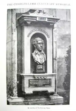 Members of the Elian dining club launched a public appeal in 1934 to fund a memorial of Charles Lamb. They commissioned Sir William Reynolds-Stephens to create a bust of the Lamb which was placed on the north wall of Christ Church Greyfriars. It was unveiled on 5 November 1935 by Lord Plender. The church was largely destroyed by bombing in 1941, but the memorial had been moved to Christ’s Hospital in Horsham for safekeeping two years earlier. At its unveiling at the school Arthur Quiller-Couch noted Lamb's beautiful and 'astonishing capacity for attracting friendship'.[4] The memorial was brought back to London in 1962 and attached to the east wall of the rebuilt watch tower of St Sepulchre-without-Newgate facing Giltspur Street.[5] Lamb was at school with S. T. Coleridge at Christ's Hospital when it was at Newgate, London, and attended services at the church alongside his classmates.