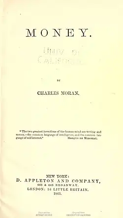 • Moran, Charles (1863). Money. New York: D. Appleton and Company – via Internet Archive.