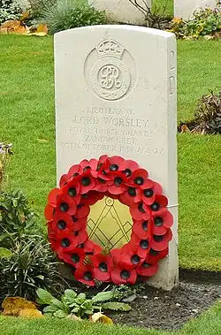 Lord Worsley's body was exhumed in 1921 and reburied in Ypres at the Town Cemetery Military Extension.[2] The inscription on his gravestone reads: HE DIED FIGHTING FOR GOD AND RIGHT AND LIBERTY AND SUCH A DEATH IS IMMORTALITY.[2] On the spot where Lord Worsley's body was originally buried by the Germans now stands the Household Cavalry Memorial in the centre of Zandvoorde. Lord Worsley's name can be seen on the memorial very near the bottom.[1]