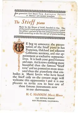 - ^ see photo: H.C. Hanson Music House Stieff Piano Announcement circa 1920.