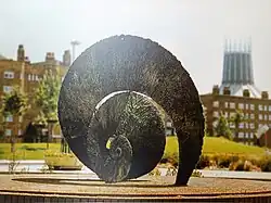 Mayer’s interest in spiral forms permeates her work. In 1984, three years after the Toxteth riots, Sea Circle was installed in central Liverpool. The 240cm high ammonite-inspired bronze sculpture followed smaller whorled table and wall pieces, Voyager (1994), and Journey, now situated on the University of Northampton’s campus.[12]
