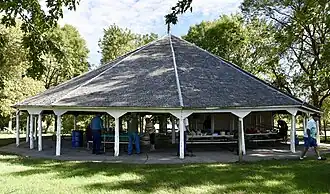 The Chautauqua Pavilion is a historic structure located in City Park in Riverton, Iowa, United States. William "Coin" Harvey, a political ally of William Jennings Bryan, founded a political fraternal order known as the Patriots of America. Fremont County, Iowa was said to have the largest number of members of any county in the US in the organization.[2] It was selected to have an experimental structure to house encampments of the Patriots. Harvey donated $500 towards its construction in the Riverton city park. Within a few years the organization died out, and the pavilion was used for summer Chautauqua shows, Sunday school and church services, school graduations and May Day observances. The 70-foot (21 m) diameter structure is 35 feet (11 m) high in the center and 9 feet (3 m) high at the eaves.[2] It is capped with a conical-shaped roof and open on the sides. The pavilion was listed on the National Register of Historic Places in 1976.[1]
