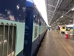 On an average, 89 trains are operated daily from the station of which 12 have 24 coaches.[31] About 400 trains arrive and depart at the station daily, including about 86 pairs of mail/express trains, in addition to 857 suburban trains handled by the five platforms at the station's suburban terminus.[33][34][35] About 400,000 passengers use the terminus every day,[9] in addition to 20,000 visitors accompanying them to see-off or receive them,[21] generating a revenue of 6,590,214,293 (US$78 million) as of 2012–2013, making it the top revenue-generating station of the Southern Railway. There is likely to be around 180,000 passengers in the station at a given point.[21] As of 2015–16, the main station alone (excluding the suburban station) has an average passenger footfall of 95,560 per day. Passenger earnings in the same period amounted to 8947.4 million. The station managed 491 trains a day. It has been projected that the number of passengers using the main station per day in the next 40 years will be 650,000.[29]