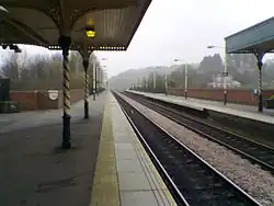 The fast lines have two large side platforms, one for each direction; these platforms are covered for around half their length. The goods lines pass around the rear of platform 2 and there is a third large platform here that serves the northbound goods line.