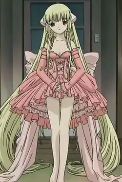 Chi makes several appearances in Tsubasa: Reservoir Chronicle,[30][31] and is voiced by in the anime by: Kaori Nazuka (Japanese version) and Trina Nishimura (English version). In this crossover series, she is created by Fai D. Flowright as a guardian of the pool where his brother's body, and eventually the sealed Ashura-ou are kept. Fai modeled Chi after his memories of his mother, and was created using one of Princess Sakura's feathers. Chi eventually disintegrates after the feather is removed and given back to Sakura. Another version of Chi appears in episode 32 of the anime where she is the queen of a world that is in a never-ending night. Chi's character is also cosplayed in the anime adaptation of Hanaukyo Maid Team: La Verite. While trying to sell manga at the "Comic manga market", Ikuyo Suzuki has the cast of characters cosplay and Mariel goes as Chi.[32]