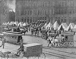 Others, a crowd of 500 not affiliated with the railroads, marched through the streets of the lumber yards and planing mills, demanding that those there quit work, which many did.[1]: 377–8 This continued until all types of industry was idle throughout the city, some for the striking of the men, and others shuttered by their owners for fear of the crowd.[1]: 377–8