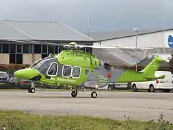 TCAA operates two helicopters from Oxford Airport and Gamston Airport.[4] The airdesk which coordinates the service remains centrally based at Coventry Airport in the same office as Warwickshire & Northamptonshire Air Ambulance.[5][6] The Children's Air Ambulance can reach anywhere in the UK within two hours and reach all of the UK's specialist children's units within 70 minutes. Children and clinical teams are moved using AgustaWestland AW169 helicopters, which were leased by the charity in 2017.[7] The helicopters always fly with two pilots and, when transporting a child, generally carry between one and three NHS clinicians,[8] including at least one senior nurse and often a consultant.[6] The new helicopters have an extra seat which can be used for either a parent to accompany their child or an additional member of clinical staff.[9]