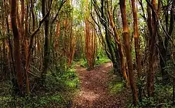 Chiloé National Park is a national park of Chile, located in the western coast of Chiloé Island, in Los Lagos Region (region of the lakes). It encompasses an area of 430.57 km2 (166 sq mi) divided into two main sectors: the smallest, called Chepu, is in the commune of Ancud, whereas the rest, called Anay, is in the communes of Dalcahue, Castro and Chonchi. The greater portion of the Park is in the foothills of Chilean Coastal Range, known as the Cordillera del Piuchén. It includes zones of dunes, Valdivian temperate rain forests, swamps, and peat bogs. A small portion, Metalqui, is an islet with an area of 0.5 km2 (0.19 sq mi). It is located between 42° 07' and 42° 13' south latitude and between 73° 55' and 74° 09' west longitude (see 42°06′S 74°01′W / 42.10°S 74.02°W).