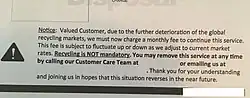 Given that the US is one of the largest producers of waste, the ban has had a great impact on the country. Some US garbage collection services have told customers that "recycling is not mandatory" now that China has stopped accepting the US recyclables, also saying that the recycling service will now incur a separate charge on the consumer's bill.[14] An example of issues resulting from that ban can be seen in Southern California municipalities who had to prepare for large cost constraints as current infrastructure could not compete with the large amounts of waste.[29] In 2016 NAFTA and Europe were the two highest consumers of plastics by developed nations. NAFTA had the largest consumption with 139 kilograms per individual, the greatest overall in the world.[30] The ban will also have the potential to cost the U.S. 6.5 billion in annual exports and remove roughly 150,000 jobs in the industry. Some US municipalities have ceased curbside pickup programs for specific paper and plastics. Robin Wiener, President of the US Institute of Scrap Recycling Industries (ISRI), said that these changes are "a big force for us in raising this issue with the US government".[31]