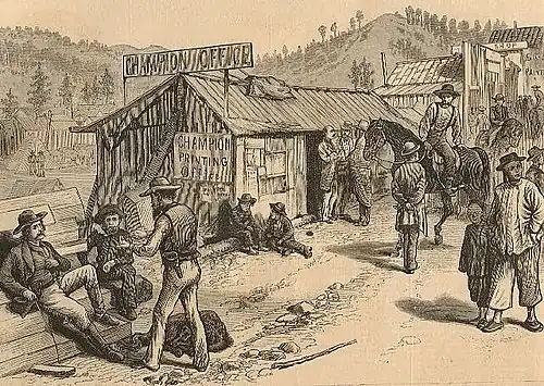 Despite intense oppression at the time, Chinese immigrants in Deadwood experienced less discrimination than in other parts of the United States.[14] However, some groups still expressed negative feelings towards the group of immigrants. Towards the later half of 1877, changes in the mining labor industry were taking place. Rather than working independently, corporate-owned mines were contracting labor. The Black Hills Times reported that "500 Chinese are expected to start arriving daily."[32] Reports like these evoked racist reactions from the mining community, who saw the Chinese as a direct threat to their financial stability. It was a common perception that these immigrants were willing to work for fewer wages than the typical mining salary of $4 to $7 of that day.[33] This tension led to the first organizational resistance in March 1878. J.O. Reed held a large gathering and created the first Caucasian League in the Black Hills, intent on protecting "white interests."[1][34] The League was supported by the Miners Union and they repeatedly gave speeches expressing their disinterest with the continued immigration of the Chinese to the Black Hills.[1] On one occasion, they stated during a speech that "bills have been presented in Congress to regulate the immigration of Chinese to this country, and for the benefit of our working classes, we hope they will pass."[35] Additionally, woodworking industry members voiced complaints about the Chinese workers who were participating in their industries.[36] Each group protested the Chinese immigrants through speeches, public displays of protest, and creating committees that would try to provide ultimatums to Chinese workers and their employers.[1]