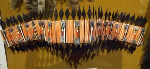 In the 1930s, he incorporated costume elements more traditional among the Miwok and other California tribes, such as the temakela, a feathered flicker-quill headband, which he made. One of his examples incorporated elements of Pomo, Maidu and Wintun traditions.[6]