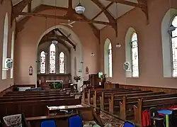 Shortly after work began, it was discovered that the church's flooring was also in need of replacement. A new floor of wooden blocks was laid in order to allow the new benches to be installed, and tiles laid in the aisle. The church's walls, gallery and font were all restored, the interior redecorated, new benches of Austrian oak installed, the pulpit relocated, the trusses of the roof altered and the east window raised and enlarged. A new oak pulpit was also gifted by friends and parishioners in memory of Rev. Dr. R. T. Wallace, the late vicar of Coxley.[8][9]