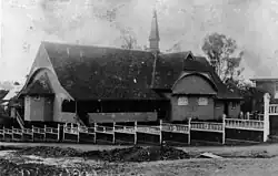 The stump capping ceremony took place on 4 June 1891.[2] The building was opened and dedicated by Bishop Webber on 18 September 1891.[3] The new church/hall building was placed on a different location within the allotment to the existing church as this continued in use while the hall was built. Some furnishings were transferred, including a stone baptismal font donated to the first chapel by Andrew Petrie. Due to the financial constraints under which the church was operating, and the original perception of the place as principally serving as a Sunday School, many of the furnishings of the church were added later. The roof was originally clad in timber shingles.[1]