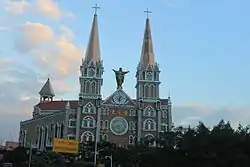 The church covers an area of 2,735 km2 (1,056 sq mi) and 64 metres (210 ft) in height of the imitation Gothic architecture style. There is a statue of Jesus at the top of the church, and he opened his arms as if to welcome the believers.[1]