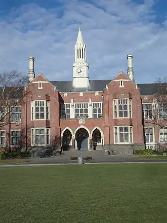 Established in 1881, the prime purpose of Christchurch Boys' High School was to prepare students for enrolment into the then newly formed Canterbury College, now known as the University of Canterbury.[3] Consequently, it was initially co-located with the College in downtown Christchurch, at the site of the modern-day Christchurch Arts Centre. As the university and school expanded, the school moved to its present location on Straven Road in 1926.[4] The school's present site was originally a farm owned by Canterbury's pioneer settlers, the Deans, and several buildings from the Deans' farm still stand on the grounds. The school's main building is registered by Heritage New Zealand as a Category I heritage building, with registration number 3658.[5]