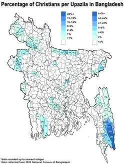 According to 2022 census, Christianity is followed by 488,583 (0.3%) people in Bangladesh.[17] Bangladeshi Christians mainly belong to Santal, Garo, Khasi, Oraon, Bom, Khyang, Panko, Lushei and other tribes. Some Bengali Christians also live in Dhaka, Gazipur, Chittagong, Barisal, Sylhet and surrounding areas.
