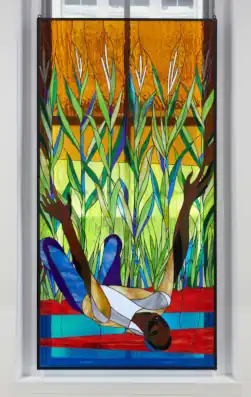 Myers's shows "The Hands of Strange Children" (2022, James Cohan) and "of all creatures that can feel and think" (Blaffer Art Museum, 2023) featured stained glass lightboxes alongside tapestries and sculpture. The stained glass works melded religious iconography (and a medium associated with sacred Christian spaces) with reconceived mythology to exalt historical anti-colonialist figures that Myers has called "failed prophets."[32][6][1] Nat Turner (2022) depicted the African-American insurgent in a moment of divine revelation inspired by the pose from Caravaggio's Conversion on the Way to Damascus (1600); in Nongqawuse (2022), the Xhosa prophet sits upon a horned bull in a restaging of the Greek myth of Zeus and Europa.[29][32][6] In 2022, Myers created the stained-glass work Be Lost Well (Stay in the House All Day) for the Brooklyn Academy of Music, which paid tribute to interdisciplinary artist Ralph Lemon.[43]