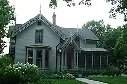 • The Thomas B. Hart House at 1609 Church Street is a Carpenter Gothic-style home built about 1857. Hallmarks of the style are the steep roofs, the bay window, and particularly the ornate bargeboards decorating the ends of the gables. They are cut with jigsaws to a different pattern on each gable, including an oak-leaf motif above the bay, a quatrefoil-and-trefoil combination above the porch, etc. Hart helped start Wauwatosa by building a sawmill on the Menomonee River around 1838, and a gristmill a few years after.[4][2]