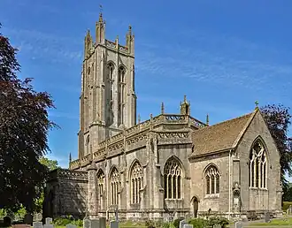 The principal feature of the exterior of the church is the tall west tower, which rises to 113.5 feet (35 metres)[2] high at the pinnacles, and was described in 1851 by Edward Augustus Freeman as one of the "highest achievements of architectural genius".[9] The tower is formed of four stages, including a tall belfry which rises through the upper two stages, common with other towers of the Long panel generation like St Cuthbert, Wells and St Peter, Evercreech.[10] A stair turret rises in the south-east corner of the tower. At the four corners are the square turrets carrying the main corner pinnacles, which each bear four smaller angle pinnacles. The large west door at the base of the tower contains tracery and heraldry in the spandrels.[11]