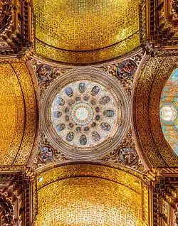 The central dome, which is magnificent in its proportions and ornamentation, is ten meters in diameter. It starts from a drum that rests on four pendentives adorned with scrolls that surround large elliptical medallions with braided molding, within which the polychrome image of the four evangelists has been represented in wood and half relief: Matthew, Mark, Luke, John.