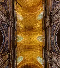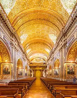 The greatest characteristic of the internal decoration of La Compañía de Quito is its very Baroque forms in carved cedar wood, polychrome and bathed in 23-carat gold leaf on a red background.[7][4] The main altarpiece, in the apse, and the richly decorated pulpit stand out above all.