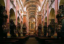 When it was rebuilt, it was rebuilt in the Baroque architecture style. The rebuilding included the addition of over 20 altars. Artists such as Jan Jiří Heinsch, Václav Vavřinec Reiner, and Petr Brandl created paintings for the altars. In 1702, an organ was installed.[2] In 1974 the church was granted the honorary title of minor basilica by Pope Paul VI.