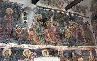 - The smaller dimensions of the building led to a diminished quantity of frescoes in the altar. In it, there is no scene of the Communion of the Apostles. The frescoes from the vault and the triumphal arch – the Ascension of Christ and the Annunciation to the Mother of God – belong to the set of Great Holidays. The conch of the apse contains unusual representations of the Virgin Mary with Christ, enthroned with St. Nicholas and St. Cyril the Philosopher. In the area below is depicted is the Adoration to Christ. In the niche, Christ lies half-naked, dead, and on the walls are three standing figures of Deacons. On the eastern and southern walls are frontal busts of two bishops.[11]