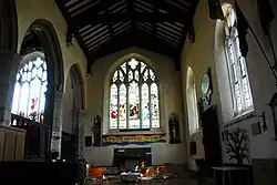 In 1724 work began to change the church roof from tiles to lead, work that was completed in 1758; until this point the church had a three-span roof but this work saw the roof assuming the one-span structure that is maintained to the current day.[22] In 1742 the plain window on the northern wall behind the pulpit was replaced "with a Square Crown Glass in order to give it better light, and also to alter the Sounding Board in such a manner as shall be thought most proper upon the opinion of the Revd. Mr. Smith, Vicar, and the workman."[22] According to Couper, the housekeeping records during this century became "more meticulous than ever"; records were kept of the monies received for each member of the congregation ("1/- for each person 'seated' in the Church or Churchyard, and 3/4 for a child's")[23] as well as for items such as "a pound of soft soap" (7d), "oyle" (3d) and "a chamber pott" (9d).[23]