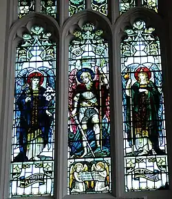 All of the stained glass in the church comes from the Victorian period; the east window (1870) was filled by Jean-Baptiste Capronnier of Brussels; the Mary window beside the pulpit (1873) is dedicated to Martha Hutchins; the window in the Lady Chapel (1884), like the Mary window, was filled by Messrs Heaton, Butler and Bayne of London.[30] The window to the north of the high altar (1899) depicts the archangels Gabriel, Michael and Raphael; it was dedicated to Henry Hall (the brewer).[30] When Hall's wife died, the mosaic to Faith and Charity, which surrounds the archangel window, was put up in 1906.[31]