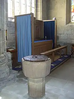 The nave at 27.6 metres (90 feet) is the longest Norman nave in Northumberland; it has a 19th-century scissor-braced roof and was restored in 1860 by John Dobson. The south aisle was built by the Percy family in the 15th century; its east window has the only surviving pieces of medieval glass in the church. The pulpit has five panels each featuring a work of art by Alfred Southwick, including St Lawrence blessing the poor and St Hilda of Whitby. On the right of the main door is the Knight's Tomb in the chantry; it features an image of a cross-legged knight from the 14th century, with a shield bearing the arms of the de Abulyn family of Durham.[8]