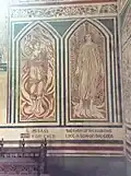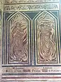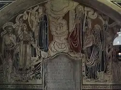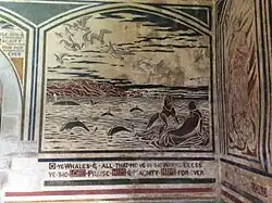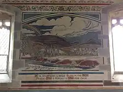 In the 1980s, the church was declared redundant and threatened with demolition.[4] It was vested in the charity the Friends of Friendless Churches in 1989, and the charity has held the freehold since 22 November 1989.[3] The charity was supported by the Victorian Society and received financial support from Cadw and the Pilgrim Trust.[4] The graveyard contains a private burial ground dedicated to members of the family of Richard Crawshay, and his nephew, Crawshay Bailey, the ironmasters of the Cyfarthfa Ironworks who had a house nearby, Maindiff Court, Abergavenny.[3] The wall paintings were restored in 2006–07 in memory of Roy Jenkins.[6] The architectural historian John Newman wrote of Sumner's decoration; "it should make Llanfair Kilgeddin a place of pilgrimage for disciples of the Arts and Crafts movement".[5] The Church of St Mary is a Grade I listed building.[7]