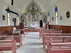 The Church of the Holy Cross is a National Historic Site of Canada,[1] located on one of the Indian reserves of the Skatin First Nation, in southwestern British Columbia. It is located on the east side of the Lillooet River on BC's first inland Gold Rush trail, the Douglas Road. Skatin Nations is the St'at'imcets language rendition of the reserve-town's usual name in English, Skookumchuck Hot Springs (often just "Skookumchuck", which means "strong water(s)", is also the name of three other places in British Columbia and in general use means a rapids - a set of rapids, historically called the "Falls" of the Lillooet River are nearby).