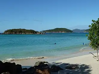 Cinnamon Cay is a cay in the United States Virgin Islands, situated approximately 0.7 miles east of Trunk Cay in the Cinnamon Bay, and 100 yards from the shore at Cinnamon Bay Beach on Saint John island. It has a height of 32 feet.[1] The islet is uninhabited, but regularly visited by scuba-divers, snorkelers and kayakers.[2] Cinnamon Bay Watersports offers kayaks and snorkeling equipment for travelers to the cay.[3] Cinnamon Cay is mostly covered with grass and cactus, and is located within the Virgin Islands National Park.[4]