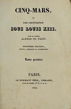 Cinq-Mars is an 1826 historical novel by the French writer Alfred de Vigny. It portrays the rebellious conspiracy of Henri Coiffier de Ruzé, Marquis of Cinq-Mars during the reign of Louis XIII in the early sixteenth century.[1] Cinq-Mars unsuccessfully attempted to overthrow the Chief Minister Cardinal Richelieu and was executed. This and other early French historical novels A Chronicle of the Reign of Charles IX (1829) and The Hunchback of Notre-Dame (1831) were inspired by the popularity of British author Walter Scott's Waverley novels in France.[2] It was de Vigny's only novel and also reflected the Gothic tone of the works of Ann Radcliffe.[3]