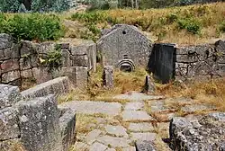 The Pedra Formosa sauna, a building designed for the public baths, stands out for its construction technique and spectacular Celtic motifs crafted in stone. The Castro had a later period of Roman occupation that started during the 3rd Century CE, being abandoned during the 4th Century CE.[1] The site also includes a chapel dedicated to Saint Romanus (c. 14th Century) and 34 graves belonging to a Christian cemetery from the Medieval age (c. 13th Century CE).[1] The Castro was first dug in 1895 by Francisco Martins Sarmento e José Leite de Vasconcelos and the last interventions were in 1995, when one of the houses was reconstructed and a warrior statue replica was put near the entrance of the second wall.[3]